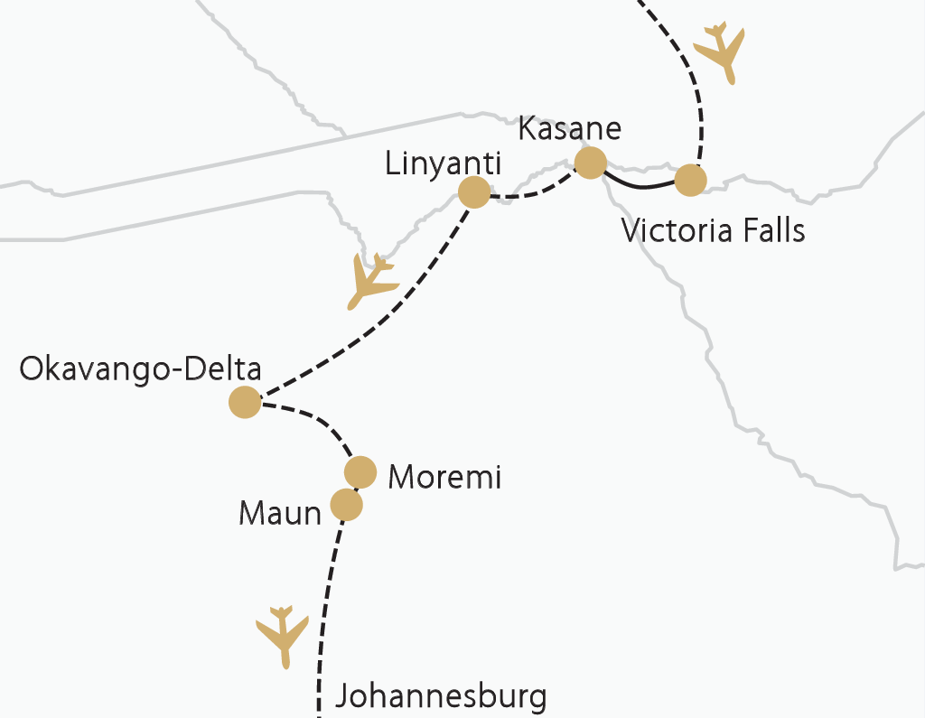 Botswana ist von den Ländern im südlichen Afrika noch immer ein ganz besonderes Reiseziel und begeistert mit seiner Weite, Unberührtheit und vor allem dem überwältigenden Tierreichtum, den Sie auf Safari-Erlebnissen zu Fuß, im Allradfahrzeug und im Einbaum in den wichtigsten Safari-Regionen erleben. Auf dieser Reise lernen Sie das Safariparadies ganz bequem mit dem Kleinflugzeug kennen und wohnen dabei in stilvollen Camps. Dabei besuchen Sie das riesige Okavango-Delta genauso wie die seltener besuchte Linyanti-Region mit großen Elefantenherden, Löwen und einer unglaublichen Vogelwelt. Der Höhepunkt zum Auftakt: Die tosenden Wasserfälle in Simbabwe sind ein Naturerlebnis mit Wow-Faktor, dass Sie nach dieser Reise von Ihrer Bucket List streichen können.