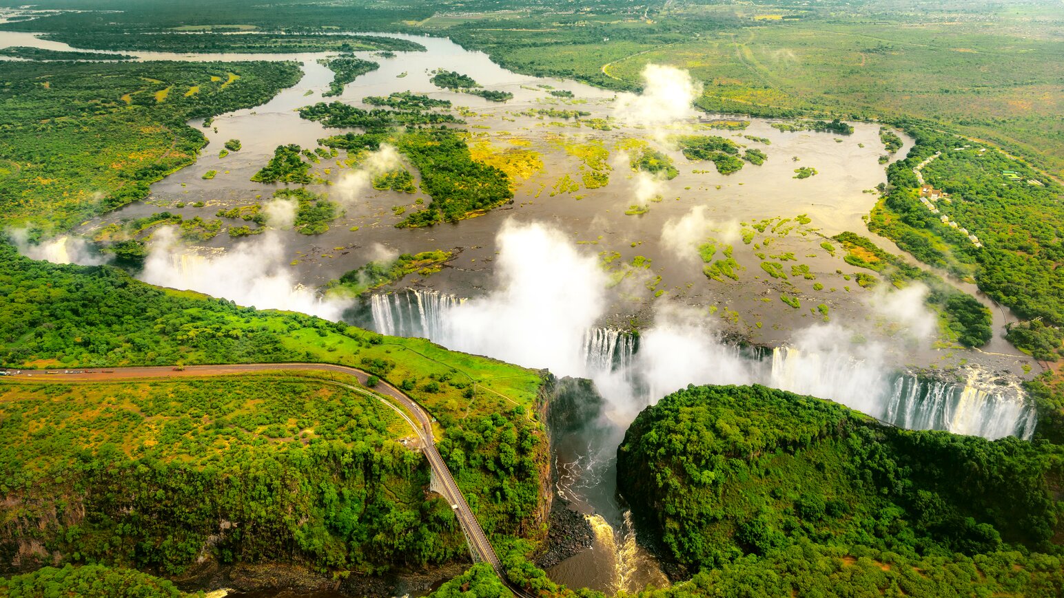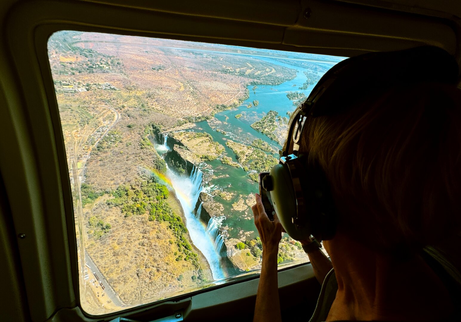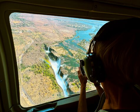 Gönnen Sie sich einen Helikopterrundflug über die Victoriafälle. Von oben erkennt man, wie breit der Sambesi ist, bevor er in die Tiefe stürzt. Während der Regenzeit zieht sich die Gischt wie ein weißes Band über den Fluss.