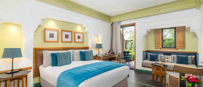 Bitte beachten Sie: Bei der Abreise im April und November übernachten Sie anstelle des Riad Palais Amani 2 Nächte im Fes Marriott Hotel Jnan Palace im Deluxe-Zimmer mit Balkon, Das Hotel bietet modernen Komfort und zeitlose Eleganz inmitten eines ruhigen Gartens.