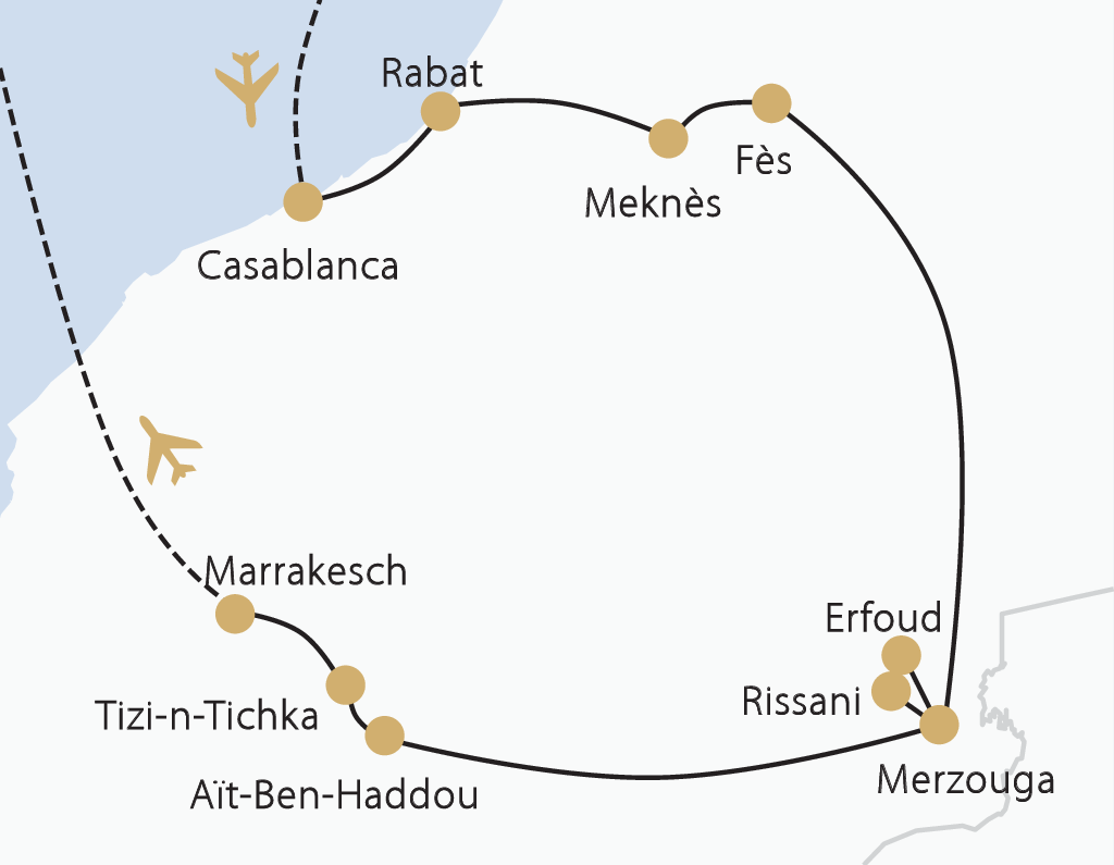 Majestätisch ragt das Atlasgebirge in den blauen Himmel. Und schon kurz darauf sanft schwingende Sanddünen, soweit das Auge reicht. Lebenspendende Oasen liegen in breiten Tälern, umgeben von kargen, schroffen Hügeln. Marokkos einsame Landschaften haben Wow-Charakter! Ganz anders die Städte: In den Souks von Fès, Meknès und Marrakesch herrscht Geschäftigkeit wie seit Jahrhunderten. Andererseits hat sich gerade in Casablanca und Marrakesch eine Szene etabliert, die Künstler aus der ganzen Welt anzieht. Erleben Sie Alt und Neu in den Königsstädten! Sie wohnen zumeist in arabisch-anmutenden Riads und genießen orientalische Gaumenfreuden.