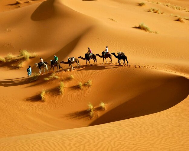 Mit dem Jeep geht es heute zum Fossilien-Abbaugebiet bei Erfoud. In zahlreichen Arbeitsschritten der Steinmetze wird das Gestein zu Platten geschnitten, poliert und als Tische, Waschbecken, Schalen, Dosen und dergleichen exportiert. Jedes Einzelstück ist einmalig. Auf dem Weg besuchen Sie eine Berberfamilie auf einen Tee zu Hause. Zur Mittagspause kehren Sie bei Rissani in einem ländlichen Restaurant ein, um die marokkanische Pizza Medfouna zu probieren. Zurück in Merzouga, stehen die Dromedare zum Ritt in den Sonnenuntergang schon bereit. Wunderschön ist das Rot der Dünen im Abendlicht. Genießen Sie den Moment der untergehenden Sonne und den warmen Sand unter Ihren Füßen. (F/M/A)
