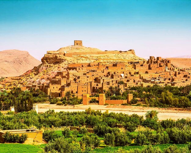 Weiter geht es zur beeindruckenden Todra-Schlucht mit den bis zu 300 m hohen Felswänden. Auf der Straße der 1.000 Kasbahs verschmelzen die jahrhundertealten Lehmburgen, das üppige Grün der Oasengärten und die rötlich schimmernden Berge im Hintergrund zu Panoramen einzigartiger Schönheit. Auf dem Weg genießen Sie zu Mittag ein traditionelles Gericht, Medfouna. Schließlich erreichen Sie Ouarzazate, in malerischer Lage zwischen Atlasgebirge und Sahara-Wüste. Sie übernachten im Ksar Ighnda, einem traditionellem Riad mit höchstem Komfort und individuellen Zimmern. (F/M/A)
