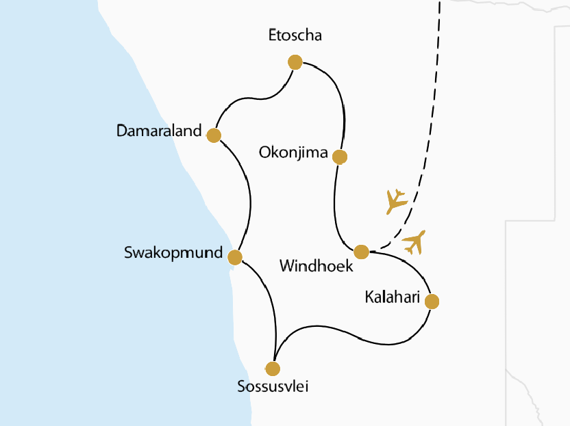 Die endlose Wüstenlandschaft der Namib in ihren Orange- und Brauntönen mit dem stimmungsvollen Wechsel von Licht und Schatten ist ein Erlebnis der Sonderklasse. Obwohl karg, wechselt die Landschaft ständig, die Leere und Weite des Landes überwältigen genauso wie der Tierreichtum in den Nationalparks. Auf dieser Selbstfahrer-Reise erleben Sie sagenhafte Landschaften - Rotes Dünenmeer, die Atlantikküste, skurrile Felsformationen und Savannen. Die Weite, geringe Bevölkerungsdichte und faszinierendes Tierleben vermitteln ein Gefühl grenzenloser Freiheit. Und am Abend Sonnenuntergänge in sandiger Einsamkeit und das funkelnde Sternenzelt des Südhimmels - all das lässt jede Alltagshast verblassen. Höhepunkte sind zweifellos die unendlichen Dünen des Sossusvlei, die Küstenstadt Swakopmund, auch kulturelles Zentrum des Landes und das Wildparadies der Etoscha-Pfanne.