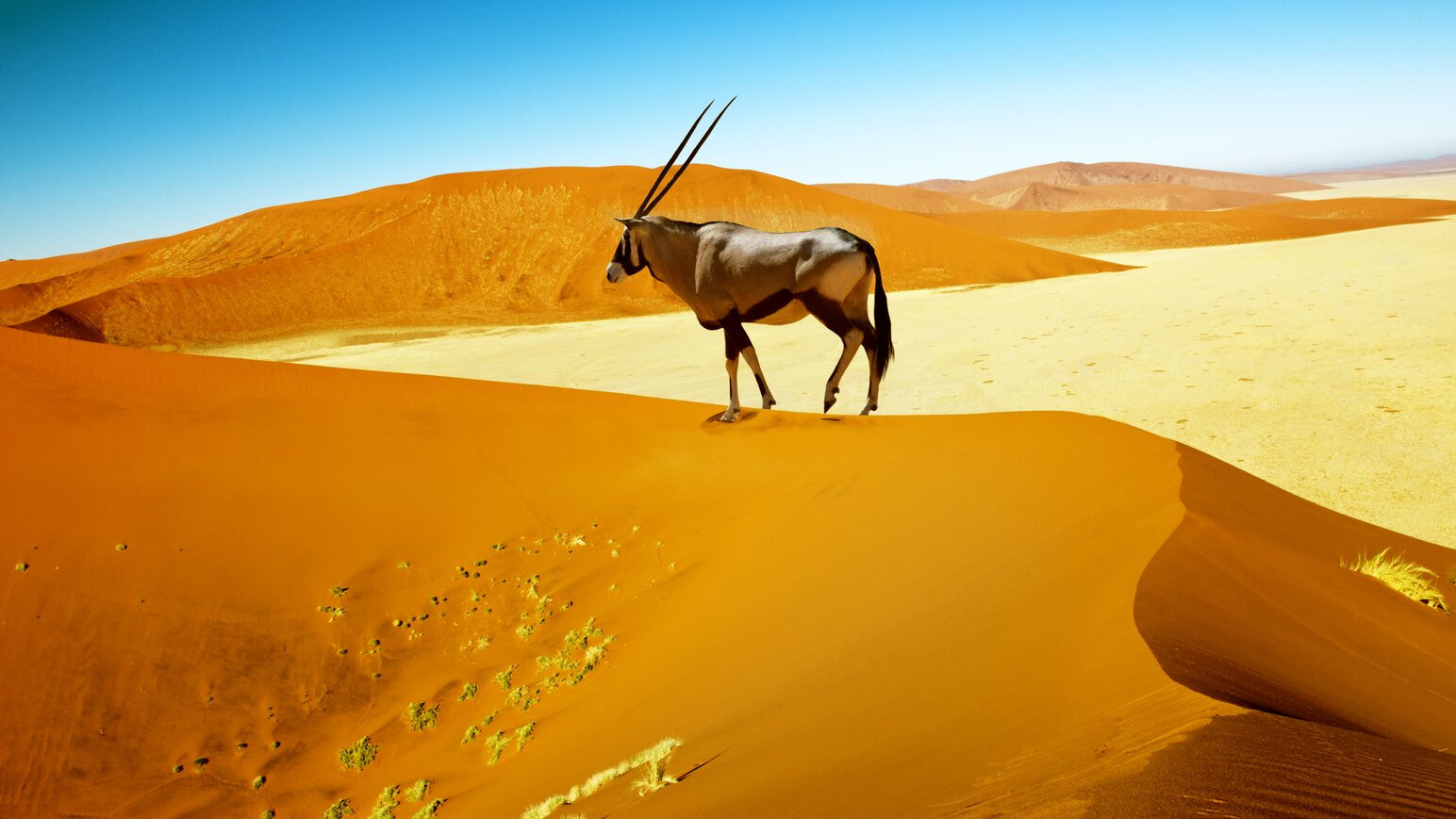 Nach Ankunft in Windhoek am Morgen Übernahme Ihres Mietwagens. Ein Allradfahrzeug ist in den kommenden Tagen Ihr fahrbarer Untersatz. Der erste Eindruck: Einsamkeit. Weite. Schönheit. Entlang der Auasberge, ein 50 km langes, aber sehr schmales und 2.000 m hohes Gebirge, geht es in die Kalahari zur Bagatelle Kalahari Game Ranch. Verbringen Sie Ihren ersten Abend auf einer der Dünen mit einem erfrischenden Getränk in der Hand und einem herrlichen Ausblick. Mit etwas Glück sehen Sie hier schon die ersten Wildtiere wie Giraffen, Kudus, Zebras, Gemsböcke, Gnus und Elan-Antilopen. (A)
