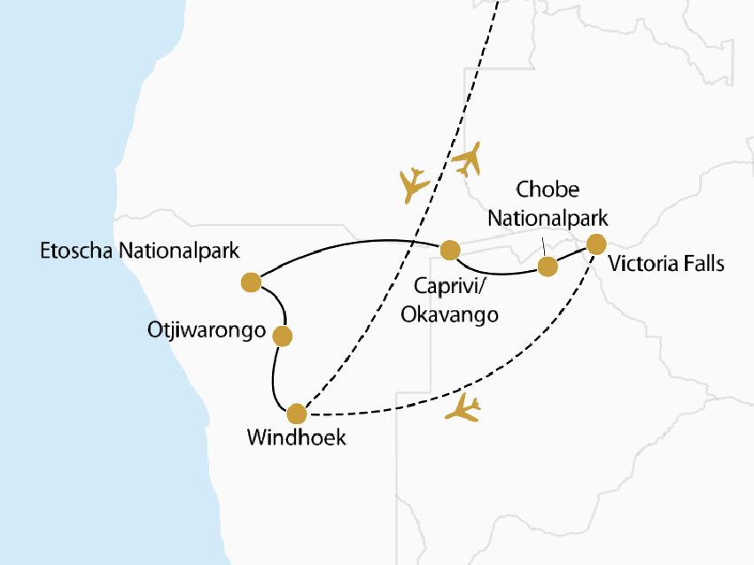 Zebras verschmelzen zu einer Wand aus Streifen am Wasserloch, belauert von Löwen, während sich in der Ferne schon die Elefanten nähern. In den Nationalparks Namibias und Botswanas finden Sie genau jene Mischung aus Idylle und Adrenalin, die eine Safari so unvergesslich macht. Vom tierreichen und weltberühmten Etoscha-Nationalpark über den weniger besuchten Caprivistreifen bis hin zum Elefantenmekka Chobe-Nationalpark führt die Tour. Sie besuchen außerdem in Simbabwe die Victoriafälle, die David Livingstone als „das Schönste, das ich in Afrika je zu Gesicht bekam“, beschrieb.