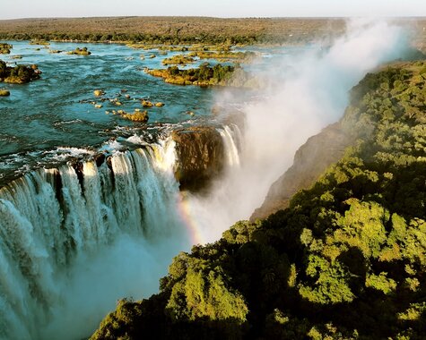 Nach dem Frühstück – wenn Sie möchten nach der Morgenpirsch – geht es anschließend zur Grenze nach Simbabwe und weiter nach Victoria Falls. Am Nachmittag besuchen Sie dieses rauschende Naturwunder auf einem bequemen Weg entlang der Schlucht. Je nach Jahreszeit bekommen Sie leichte Regencapes, um sich gegen die Gischt zu schützen. Sie wohnen in der Ilala Lodge so nah an den Fällen, dass Sie die Gischt sehen können. In der wunderschön gepflegten Gartenanlage sind in der Dunkelheit mitunter Nilpferde unterwegs. (F/A)