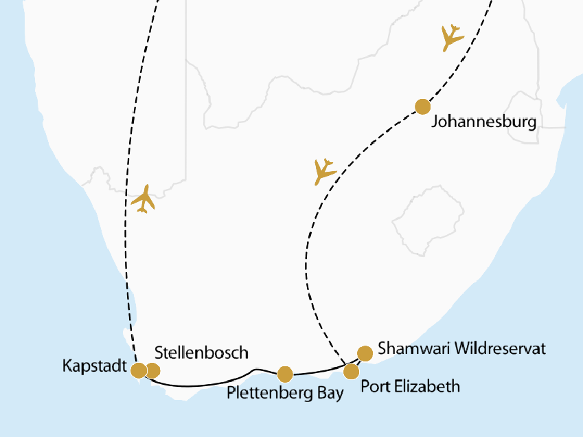 Südafrika gilt als eines der facettenreichsten Reiseziele des afrikanischen Kontinents – und diese Reise bringt Sie zu den Höhepunkten: Im privaten, malariafreien Shamwari Game Reserve erleben Sie Safari auf höchstem Niveau – mit faszinierenden Tierbegegnungen, darunter die legendären Big Five, einer reichen Vogelwelt und eindrucksvollen Landschaftspanoramen. Entlang der weltberühmten Garden Route und bis zur dramatischen Kapspitze offenbart sich Ihnen eine spektakuläre Küstenlandschaft – mit schroffen Felsen, weißen Sandstränden und der ungezähmten Kraft des Meeres. In der traditionsreichen Weinregion rund um Stellenbosch begegnen Sie der kapholländischen Geschichte – und verkosten erlesene Weine inmitten herrlicher Rebgärten. Kapstadt begeistert mit kosmopolitischem Flair, erstklassiger Gastronomie und dem majestätischen Tafelberg, der sich eindrucksvoll über der breiten Bucht erhebt. Nicht zuletzt machen auch die kulinarischen Genüsse – von exquisiter Küche bis zu vielfach prämierten Weinen – Südafrika zu einem Erlebnis für alle Sinne.