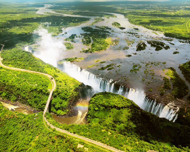 Wenn der Ausspruch "Einmal sehen ist besser als tausendmal hören" auf irgendein Weltwunder zutrifft, dann auf die unglaublichen Victoriafälle. An der Grenze zwischen Sambia und Simbabwe stürzt sich der Sambesi über eine Breite von 1.700 Metern mit gewaltigem Getöse in eine gigantische Schlucht, die gewaltige Gischtwolke steigt dabei bis in den Himmel hinauf. Seit 1989 sind die Victoriafälle UNESCO-Weltnaturerbe. Während einer geführten Wanderung am Vormittag geht es durch den Regenwald und entlang der Wasserfälle. Der Nachmittag steht Ihnen zur freien Verfügung. (F)