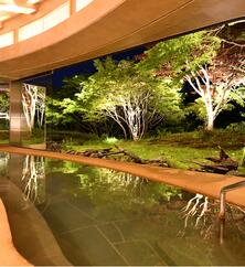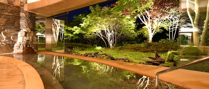 Onsenbad mit Thermalwasser und Blick in den Garten
