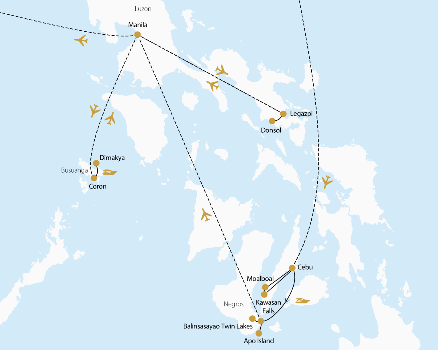 Am frühen Morgen brechen Sie auf zum Flughafen Legazpi und fliegen via Manila weiter nach Busuanga (Flugdauer insgesamt ca. 5 Std.) – ein Inlandsflug mit spektakulären Ausblicken. Nach Ihrer Ankunft erwartet Sie eine kurze Bootsfahrt zur abgelegenen Insel Dimakya. Dort liegt das Discovery Coron, ein exklusives 19 Hektar großes Privatinsel-Resort, das sich perfekt für ruhige Tage im Einklang mit der Natur eignet. Der Rest des Tages steht Ihnen zur freien Verfügung. Unternehmen Sie erste Erkundungstouren – zum Beispiel zu den faszinierenden Twin Lagoons, umgeben von smaragdgrünem Wasser und bizarr geformten Kalksteinfelsen. Vielleicht lockt Sie eine Safari auf Calauit Island, Heimat seltener Tierarten, oder ein kurzer Hike zum höchsten Punkt der Insel mit atemberaubender Aussicht. Wer die Unterwasserwelt liebt, kann direkt am geschützten Hausriff schnorcheln oder tauchen – oder das Wrack der Kyokuzan Maru, ein japanisches Frachtschiff aus dem Zweiten Weltkrieg, entdecken. Diese Insel birgt Abenteuer, Naturwunder und Ruhe zugleich. (F)