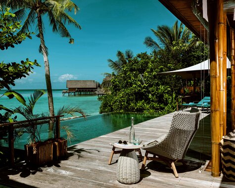 Ausstattung: Kingsize-Bett, Outdoor-Regendusche, Glasbodenfenster, private Lounge & direkter Zugang zum Meer