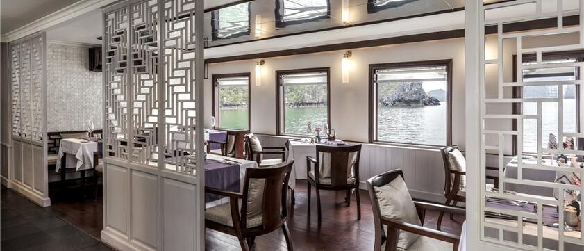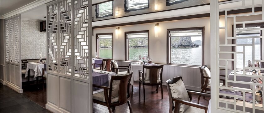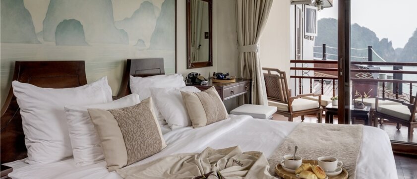 Frühaufsteher beginnen den Tag mit frischem Kaffee und Gebäck, gefolgt von Tai Chi auf dem Sonnendeck oder einer Meditation auf einer nahegelegenen Insel. Nach einem reichhaltigen Frühstück führt der erste Ausflug zur Thien Canh Son Höhle: Ein kurzer Aufstieg eröffnet einen spektakulären Blick über die Bucht, während im Inneren geheimnisvolle Stalaktiten und Stalagmiten eine fast magische Atmosphäre schaffen. Anschließend besuchen Sie das schwimmende Dorf Vung Vieng, wo Sie Einblicke in das Leben der Fischerfamilien und ihre traditionellen Perlenfarmen erhalten. Zurück an Bord erwartet Sie ein köstliches Mittagessen, bevor Workshops wie Austernernten oder die Zubereitung von vietnamesischem Phin-Kaffee spannende Einblicke bieten. Am Nachmittag ankert das Schiff an einem abgeschiedenen Strand – ideal für ein erfrischendes Bad, Sundowner mit Canapés und entspannte Momente im goldenen Licht. Den Tag krönt ein festliches Dinner mit optionalen Abendaktivitäten an Bord. (F/M/A)