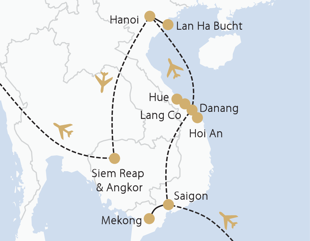 Indochina gleicht einer Reise durch die Jahrhunderte - von den Relikten der Khmer bis in die Gegenwart. In Vietnam erleben Sie die vergangene Pracht kaiserlicher Paläste in Hue und religiöse Rituale in Hoi An. Saigon glänzt mit modernen Wolkenkratzern und französischem Kolonial-Flair. Zeitlos schön sind die winzigen, dicht bewachsenen Inselchen der Halong- und Bai Tu Long Bucht, die Sie auf einem kleinen Boutique-Schiff ausführlich erleben. In Kambodscha locken die Tempelwunder von Angkor, allen voran die Anlage Angkor Wat und der Tempel Ta Prohm. Höhepunkt Ihrer Reise: Eine Ballonfahrt über die Khmer-Landschaft zum Sonnenaufgang.