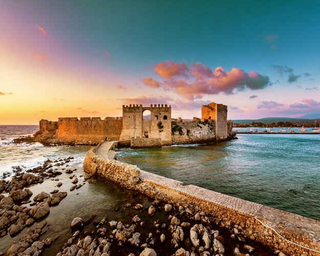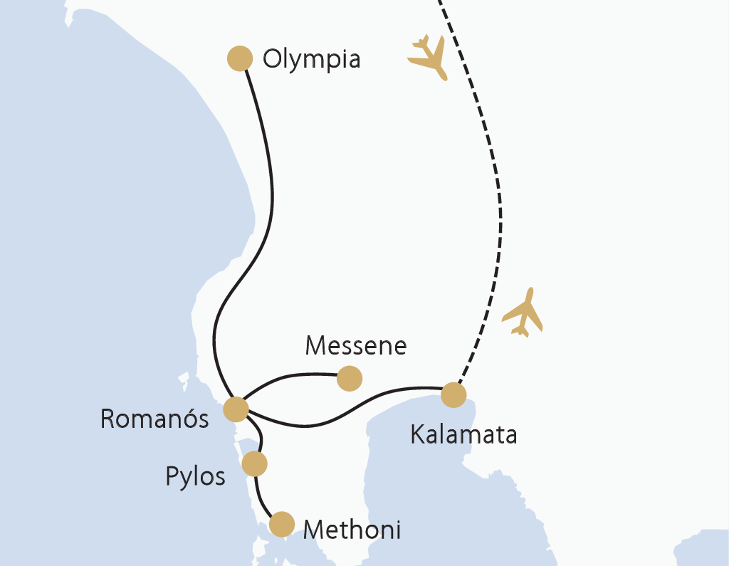 Nach dem Frühstück starten Sie gemeinsam mit Ihrer Reiseleitung nach Pylos (ca. 28 km vom Hotel entfernt), einer kleinen malerischen Küstenstadt in der Navarino-Bucht. Der Ort hat den größten natürlichen Hafen auf der Peleponnes und ist dank der außergewöhnlichen Schönheit der Umgebung und der langen Geschichte ein beliebtes Ziel. Von der Platia am kleinen Hafen führen alle Wege hangaufwärts, teils über Treppen geht es in schmale Gassen; immer wieder öffnet sich der Blick zum Meer. Sehenswert ist vor allem die alte Burg aus dem 13. Jahrhundert, die die strategisch wichtige Bucht überwachen sollte. Einen Besuch wert ist auch die Höhle von König Nestor, einem antiken Herrscher über Pylos, der die Höhle als Zufluchtsort für sein Vieh nutzte – so sagt es die Sage. Außerdem fahren Sie ins nahe Dorf Methoni, in dem die Stadtmauern und Tore gut erhalten sind. Ein Wahrzeichen ist der Burtzi am Südende des Kaps, ein Meeresturm mit markanter Kuppel. Der Nachmittag steht zur freien Verfügung. (F)
