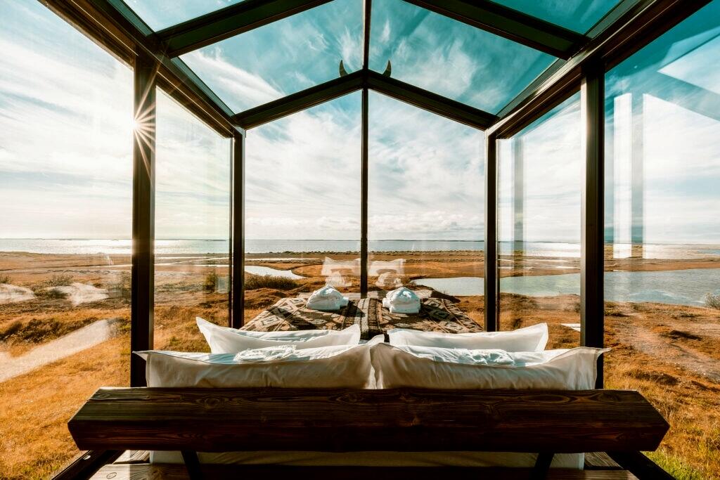 Nach dem Frühstück wechseln Sie zu einer weiteren Unterkunft mit Wow-Charakter: Die Glashütte Njord nahe dem hübschen Ort Borgarnes ist ein stylischer Rückzugsort inmitten der ungezähmten Schönheit West-Islands, Oase aus Glas, ausgestattet mit einem gemütlichen Kingsize-Bett, privatem Bad, sonniger Terrasse und eigenem Hot Pot unter freiem Himmel. Durch die bodentiefen Fenster und das Glasdach genießen Sie einen ungestörten und spektakulären 360 Grad-Panoramablick: Vor Ihnen liegt das Meer, dahinter die majestätische Bergkette der Snæfellsnes-Halbinsel und die malerische Stadt Borgarnes, eingebettet in die Weite des Westens. Sie wohnen ruhig und abgeschieden direkt an einem alten Reitweg – hier kann es passieren, dass Islandpferde vorbeiziehen und das Bild vollends perfekt machen. Kein Straßenlärm, keine Hektik – nur Wind, Weite und Natur. Auf dem rund zweistündigen Weg könnten Sie einen Abstecher zum Þjórsárdalur-Tal nehmen: Historische Bauernhöfe und das rekonstruierte Wikingerhaus Stöng liegen in einer beeindruckenden Landschaft aus Lavaboden, Birkenwald und Flussläufen.