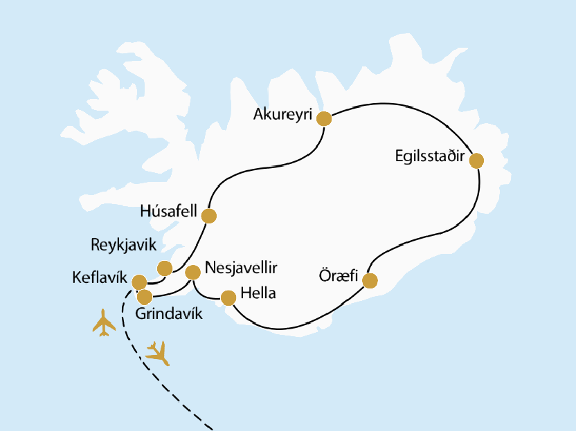 Fahrt zum Flughafen Keflavík und Rückgabe Ihres Mietwagens. Rückflug mit Icelandair (Flugdauer ca. 3,5 Std.), Ankunft am Mittag. (F)