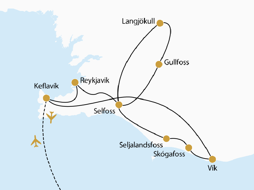 Kurze Fahrt zum Flughafen Keflavík und Rückgabe Ihres Mietwagens. Rückflug mit Icelandair (Flugdauer ca. 3,5 Std.), (F)