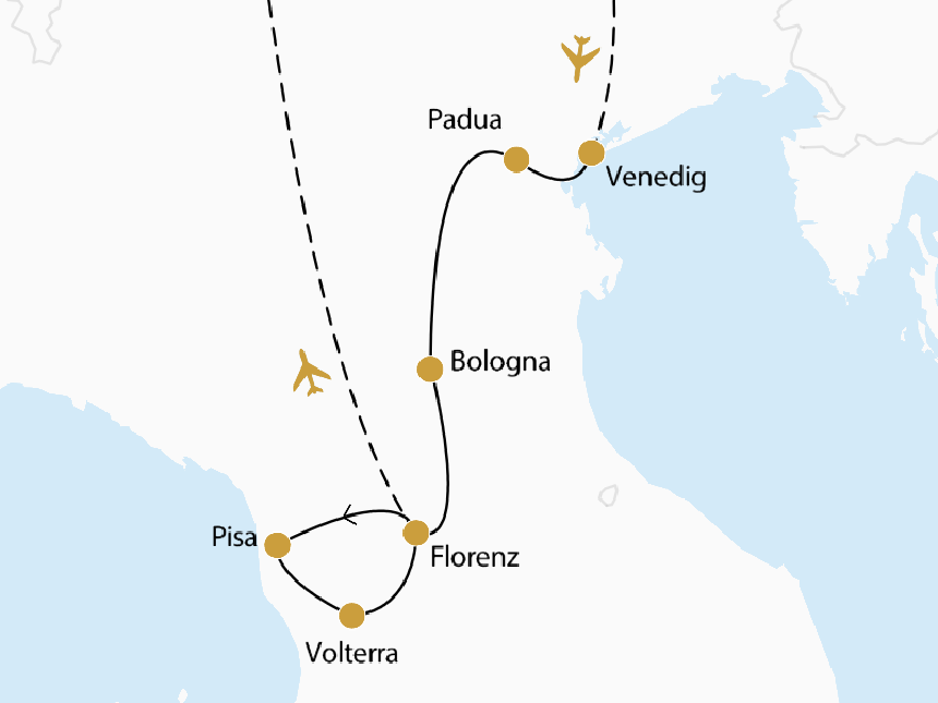 Eine Reise durch das Herz Italiens führt Sie auf die Spuren eines der größten Wissenschaftler der Geschichte: Galileo Galilei. Von Padua, wo er revolutionäre Entdeckungen machte, über Bologna und Pisa, seiner Geburtsstadt, bis hin nach Florenz, dem Zentrum der Renaissance, erzählt jede dieser Städte eine faszinierende Geschichte über das Leben und Werk dieses außergewöhnlichen Gelehrten. In professioneller Begleitung durch den promovierten Astronomen Herrn Dr. Peter Habison, starten Sie auf einer Reise durch die Wissenschaft und die Schönheit Italiens. Sie entdecken die Orte, die Galileo Galilei geprägt haben und die er selbst geprägt hat. Tauchen Sie ein in eine Welt der Wissenschaft und der Kunst, und lassen Sie sich von der historischen Atmosphäre als auch dem kulturellen Reichtum dieser beeindruckenden Städte verzaubern. Dabei bleibt Ihnen die kulinarische Vielfalt von Venetien, der Emilia Romana als auch der Toskana nicht vorenthalten.