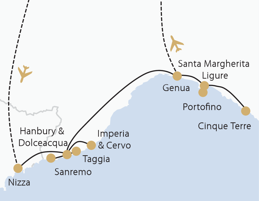 Ligurien ist jener Küstenstreifen, der sich von der Grenze nach Frankreich entlang des Golfes von Genua zieht: abwechslungsreich und vielseitig. Schon vor über 100 Jahren entdeckte die Hautevolee das gemäßigte Klima zwischen Meer und Seealpen. Stars und Sternchen treffen sich bis heute in Sanremo, dessen botanischer Garten ein UNESCO-geschütztes Gesamtkunstwerk ist. Immer wieder locken schattige Altstädte mit schmalen Gassen, die von Boutiquen, Cafés und Restaurants gesäumt sind. Sie erkunden auch die bunten Dörfer Cinque Terre und die alte Seefahrerstadt Genua. Dabei wohnen Sie in prächtigen Grandhotels in bester Lage.
