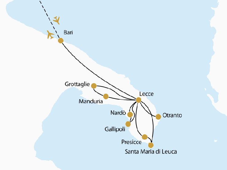 Nach dem Frühstück, begleitet vom Duft der frischen Morgenluft, beginnt Ihr Tag in Lecce – der barocken Schönheit des Südens. Sie schlendern durch verwinkelte Gassen, vorbei an kunstvoll verzierten Fassaden, entdecken die Piazza Duomo, die prunkvolle Basilika Santa Croce und charmante Innenhöfe, die sich wie kleine Geheimnisse öffnen. Ein kurzer Halt für einen originalen Caffè Leccese – eiskalt, mit Mandelmilch – darf natürlich nicht fehlen. Danach heißt es: Schürze an, Hände in den Teig! Beim traditionellen Pasticciotto-Workshop lernen Sie, wie das goldene Gebäck aus Mürbeteig und Vanillecreme entsteht – mit einer köstlichen Sauerkirsche im Herzen. Frisch aus dem Ofen schmeckt es am besten. Am Nachmittag geht es weiter nach Otranto. Kaum eine Stunde entfernt, erwartet Sie das intensive Blau der Adria. Sie atmen salzige Meeresluft, bummeln durch die Altstadt, bewundern das Bodenmosaik der Kathedrale und genießen von den alten Stadtmauern aus den Blick aufs offene Meer – besonders schön, wenn die Sonne glutrot untergeht. (F)