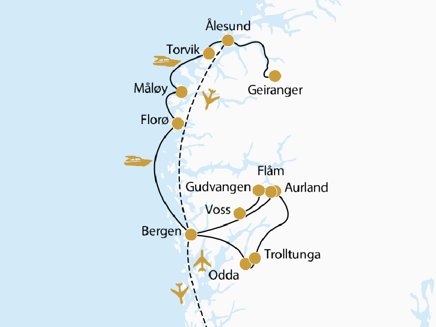 Entdecken Sie Norwegens beeindruckende Naturwelt ganz entspannt im Privatwagen und in Ihrem eigenen Tempo. Die Reise führt Sie durch spektakuläre Landschaften mit dramatischen Fjorden, rauschenden Wasserfällen und imposanten Felsformationen, wo die Natur noch ursprünglich ist. Erkunden Sie stille Täler, wandern Sie entlang kristallklarer Bergseen und genießen Sie die Ruhe der norwegischen Wildnis. Besondere Übernachtungen beim Glamping oder in außergewöhnlichen Baumhaus-Suiten lassen Sie der Natur ganz nah sein. Ergänzt wird das intensive Naturerlebnis durch Aufenthalte in den charmanten Küstenstädten Bergen und Ålesund, wo maritime Kultur und elegante Jugendstilarchitektur aufeinandertreffen. Diese Reise verbindet tiefgehende Naturerlebnisse mit urbanem Flair – eine harmonische Balance aus Abenteuer, Entschleunigung und Komfort.