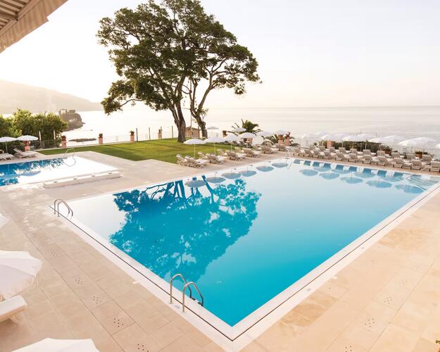 Team Hotels & HideawaysWo das Grün von subtropischen Gärten auf das Blau des Atlantiks trifft, genießt das Belmond Reids Palace in der Bucht von Funchal eine privilegierte Lage. Mit seiner klassischen Eleganz, die die Seele des 1891 eröffneten Hotels noch in sich trägt und dennoch einen bezaubernden zeitgemäßen Komfort mit sich bringt, besticht das Anwesen durch eine ungezwungene Atmosphäre, traumhafte Panoramen und erstklassigen Service. Wenn Sie den Blick vom Pool über das Meer schweifen lassen, wird klar, warum sich die internationale Prominenz hier ein Stelldichein gibt. Ein Gefühl der himmlischen Freiheit eröffnet sich Ihnen bei einem ganz besonderen Genussmoment: Die legendäre Tea Time auf der mit Schachbrettmuster versehenen Terrasse hoch über der Bucht zelebriert das Leben voller Stil. Zieht Sie schließlich der glitzernde Atlantik unter Ihnen wie magisch an, erreichen Sie Ihn mitsamt einem Naturschwimmbeckens komfortabel mit dem Aufzug.
