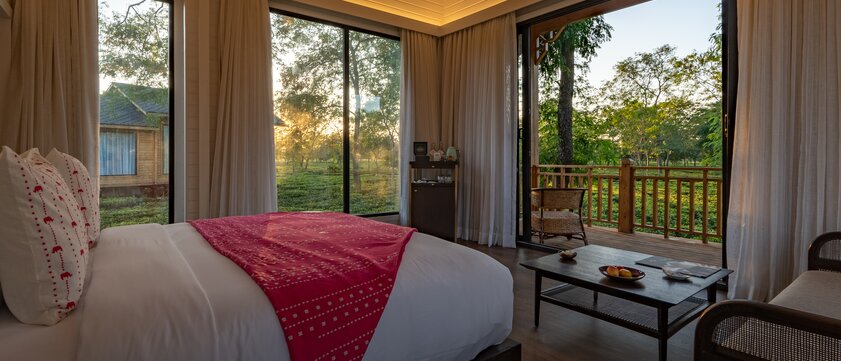 Nach dem Frühstück heißt es Abschied nehmen vom The Postcard und im Privattransfer geht es zum Kaziranga Nationalpark, einem UNESCO-Weltnaturerbe und Schutzgebiet für die größte Population des bedrohten Panzernashorns mit nur einem Horn. Die Fahrt dorthin dauert etwa zwei Stunden und führt durch die weiten Ebenen Assams – ein Übergang vom stillen Teeparadies zur lebendigen Wildnis. Nach Ihrer Ankunft beziehen Sie Ihre Unterkunft in der Diphlu River Lodge, einer charmanten, ökologisch gestalteten Lodge direkt am Flussufer des Diphlu. Von hier aus liegt der Nationalpark nur einen Flussarm entfernt – Sie sind der Natur ganz nah. Nach dem Mittagessen brechen Sie auf zu Ihrer ersten Jeep-Safari im westlichen Teil Kazirangas. Dieses Gebiet ist besonders bekannt für seine hohe Dichte an Nashörnern, Wasserbüffeln und anderen Wildtieren. Mit etwas Glück erleben Sie unvergessliche Begegnungen in der goldenen Nachmittagssonne, zwischen Elefantengras und stillen Wasserläufen. Am Abend kehren Sie in die Lodge zurück. Lassen Sie den Tag in der friedlichen Atmosphäre am Flussufer ausklingen – mit dem Gefühl, angekommen zu sein in der wilden Seele Assams. (F/A)