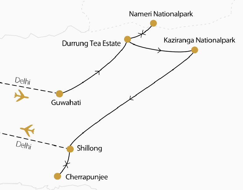 Abseits der üblichen Reiserouten entdecken Sie Assam, eine der ursprünglichsten und vielfältigsten Regionen Indiens. Bekannt für seinen weltberühmten Assam-Tee verbringen Sie hier mehrere Tage auf einem traditionellen Tea Estate, umgeben von endlosen, smaragdgrünen Plantagen. Tauchen Sie ein in die Kunst der Teeverarbeitung und genießen Sie die friedliche Atmosphäre des Anwesens. Gleichzeitig erwarten Sie faszinierende Safari-Erlebnisse in den Nationalparks Nameri und Kaziranga. Diese Schutzgebiete bieten einzigartige Begegnungen mit seltenen Tieren wie dem vom Aussterben bedrohten Panzernashorn, Elefanten und einer beeindruckenden Vogelvielfalt. Auf zahlreichen Safaris nach afrikanischem Vorbild spüren Sie die Umgebung mit allen Sinnen. Nur wenige Hotelwechsel zeigen Ihnen die gesamte Palette der Schönheit der Region, ob am Fluss Diphlu oder am Umiam-See – ein perfekter Mix aus Natur, Kultur und authentischem Indien.