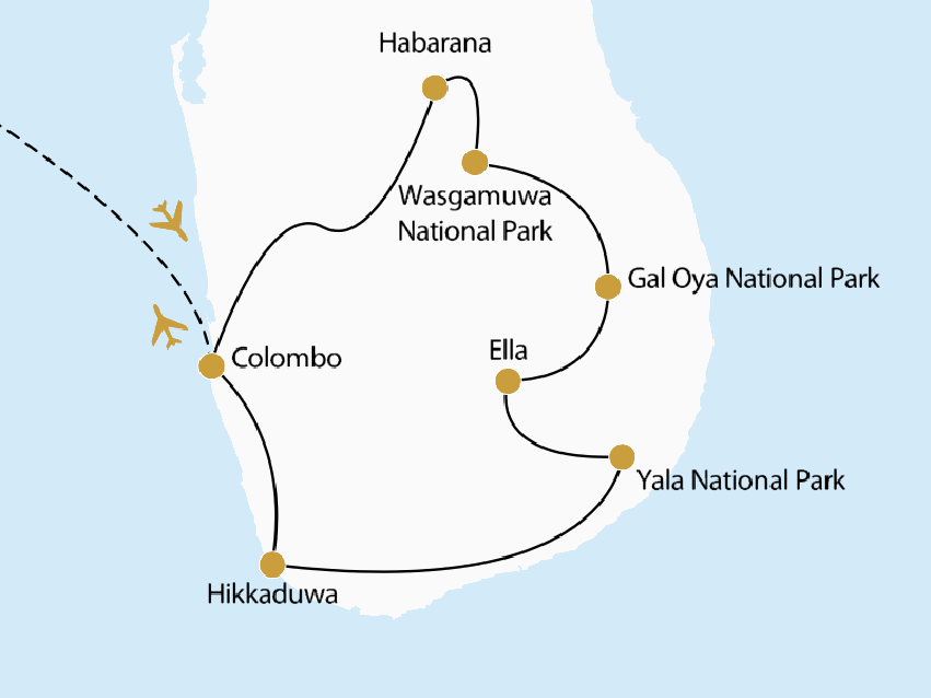 Sie fliegen von Frankfurt, Berlin oder München mit Qatar Airways über Doha nach Colombo (Flugdauer insg. ca. 12 Std.).