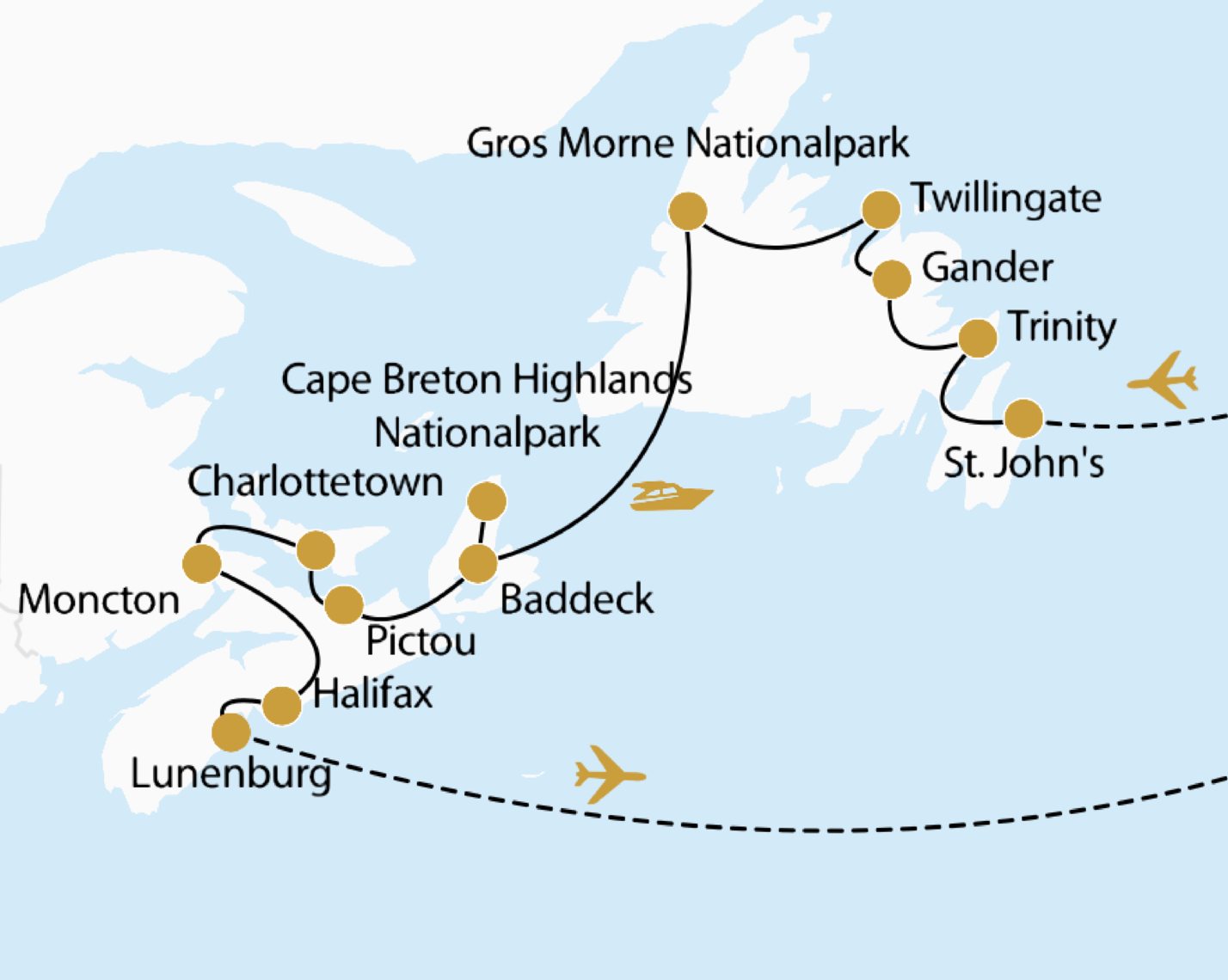 Am Morgen startet Ihr Langstreckenflug mit Star Alliance über Halifax nach St. John‘s (Insg. ca. 11 Std.) Empfang am Flughafen durch Ihren Reiseleiter und Transfer zu Ihrem Hotel. St. John’s ist die älteste englische Siedlung Nordamerikas, die Hauptstadt von Neufundland und Labrador und bekannt für bunte Häuser, historische Leuchttürme und lebendige Hafenatmosphäre.