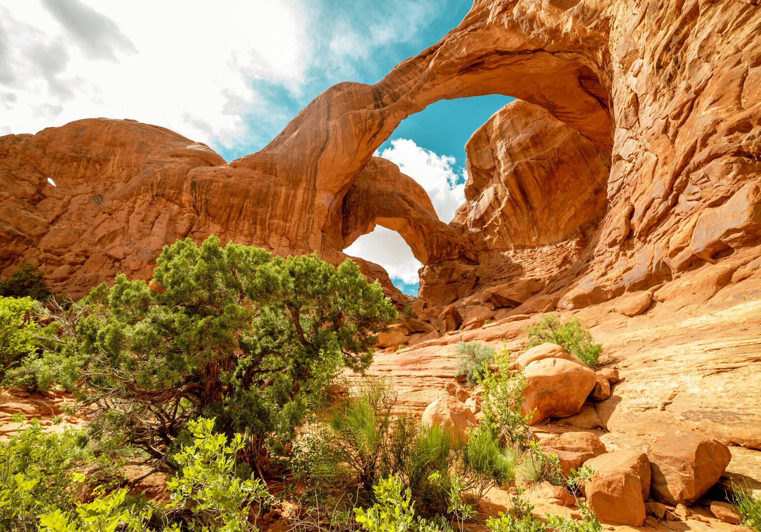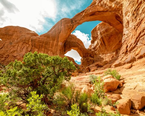 Nach einem gemütlichen Frühstück verlassen Sie die grünen Höhen Colorados und fahren etwa drei Stunden westwärts in die weiten Landschaften Utahs – ein Übergang von alpiner Frische in die archaische Schönheit der roten Wüste. Schon bei der Ankunft in Moab empfängt Sie die dramatische Kulisse aus zerklüfteten Felsen, leuchtend rotem Sandstein und weitem Himmel – ein erster Vorgeschmack auf das Naturwunder, das Sie erwartet. Am Abend werden Sie von Ihrem lokalen Naturführer am Hotel abgeholt und begeben sich auf eine exklusive Sonnenuntergangstour in den Arches Nationalpark. Wenn das Licht weich wird und die Farben der Felsen glühen, wandern Sie entlang schmaler Sandsteinpfade zu verborgenen Juwelen wie dem Tower Arch, dem Eye of the Whale oder den Marching Men – weitab der bekannten Besucherpfade. Zurück in Moab erwartet Sie das stilvolle Hoodoo Moab Hotel, das modernen Komfort mit wüsteninspirierter Architektur vereint – ideal gelegen, um die Abende entspannt bei einem Drink oder einem Bummel durch die lebendige Kleinstadt ausklingen zu lassen. (F)