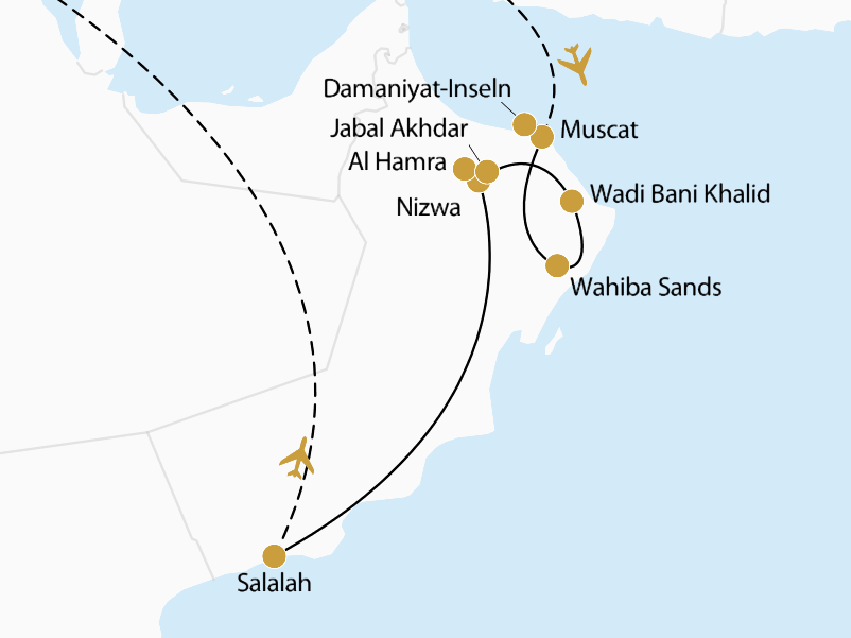 Sie fliegen am Abend mit Oman Air nonstop ab Frankfurt (Flugdauer ca. 7 Std.) nach Muscat.