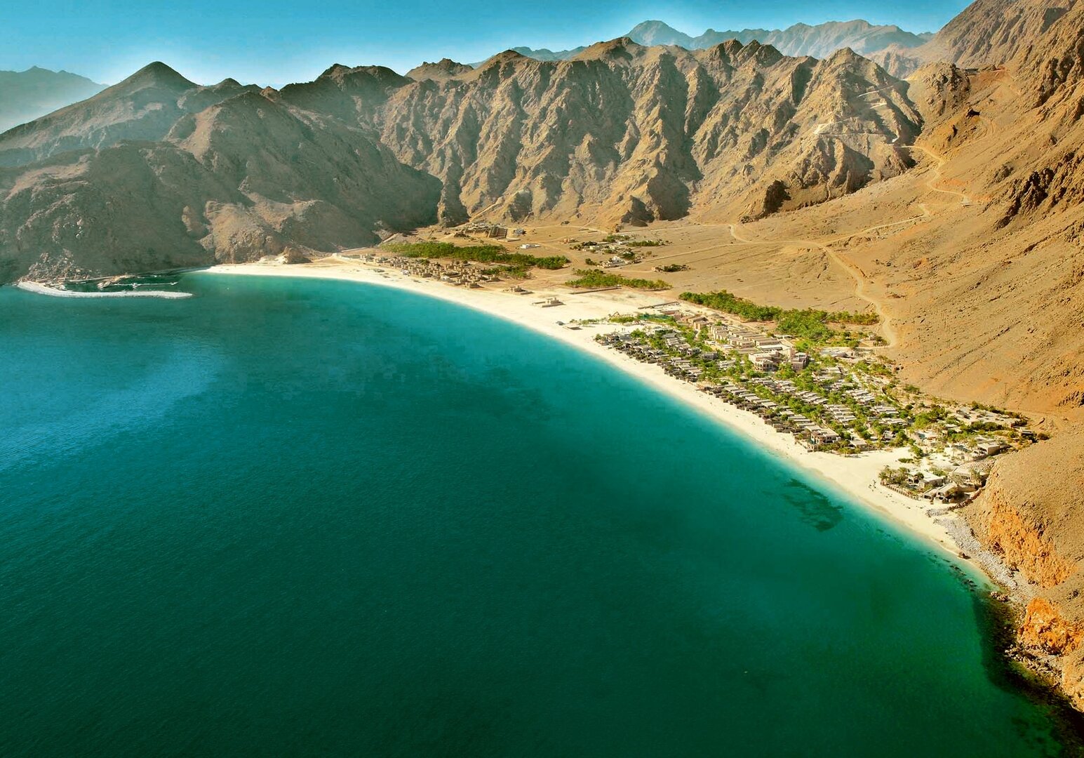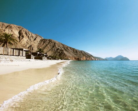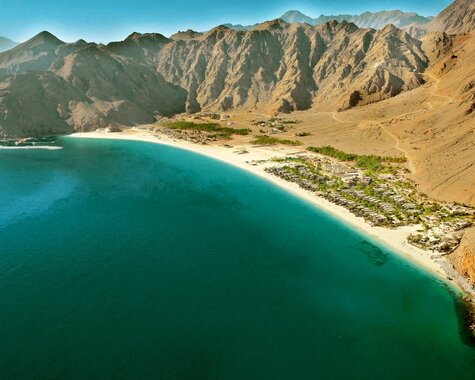 Kaum ein Hotel beginnt so spektakulär: Entweder schwebt man per Paragliding über das Hajar-Gebirge oder erreicht Zighy Bay per Boot – der Alltag bleibt garantiert zurück