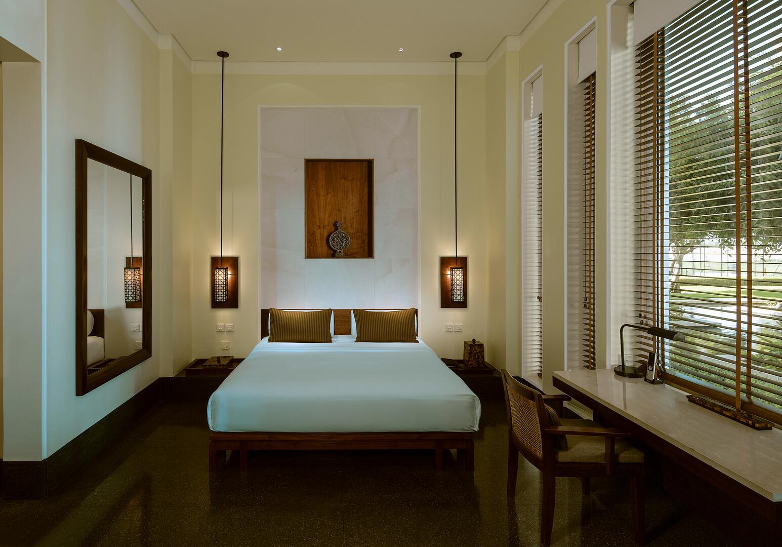 Einzigartig ist die Kombination aus traditioneller omanischer Baukunst mit asiatischer Zen‑Ästhetik: weiße Gebäude, ruhige Wassergärten und edle Materialien schaffen ein zeitloses Rückzugs‑Ambiente am Meer
