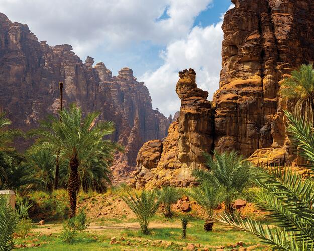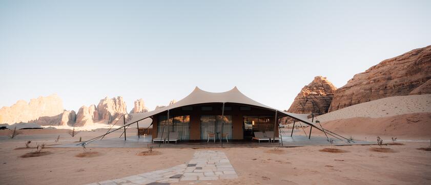 Sie verlassen Tabuk und fahren in südlicher Richtung durch eine sich ständig wandelnde Wüstenlandschaft, bis Sie das spektakulär schöne Wadi Al Disah, das "Tal der Palmen", erreichen. Die etwa 15 Kilometer lange Schlucht ist eingerahmt von senkrecht aufragenden, glatt geschliffenen Felswänden und massiven roten Felssäulen, die sich bis zu 500 Meter in den Himmel recken. In diesem imposanten Canyon entspringt ein Fluss, der ein überraschend grünes Paradies inmitten der Wüste erschafft - mit Palmen, Gräsern, Minzsträuchern und Zitronenbäumen. Neben der atemberaubenden Natur finden sich hier auch archäologische Stätten, darunter nabatäische Gräber, die stumme Zeugen vergangener Kulturen sind. Das Wadi eignet sich hervorragend für eine leichte Wanderung nach der Offroad-Fahrt. Inmitten dieser faszinierenden Kulisse genießen Sie ein stimmungsvolles Picknick unter freiem Himmel. Anschließend setzen Sie Ihre Reise fort und erreichen am späten Nachmittag die legendäre Oasenstadt AlUla. Wenn sich die Sonne dem Horizont nähert, erleben Sie einen besonderen Moment: den Besuch des Elephant Rock, AlUlas bekanntester geologischer Felsformation. In bequemen, versenkten Sitzgelegenheiten können Sie die Szenerie auf sich wirken lassen, während sich die Felsgestalt majestätisch vor dem abendlichen Himmel erhebt. Ein Café direkt vor Ort verwöhnt Sie mit köstlichen Süßigkeiten und warmen Getränken. Für die kommenden zwei Nächte wohnen Sie im exklusiven Ashar Tented Resort, einem luxuriösen Rückzugsort im Herzen des Ashar Valley. Eingebettet in eine atemberaubende Felsenlandschaft bietet das Resort spektakuläre Ausblicke auf das Tal und die funkelnde Fassade der legendären Maraya Hall – das größte verspiegelte Gebäude der Welt. Hier verschmelzen Natur, Stille und Komfort zu einer traumhaften Einheit. Abendessen im Resort. (F/M/A)