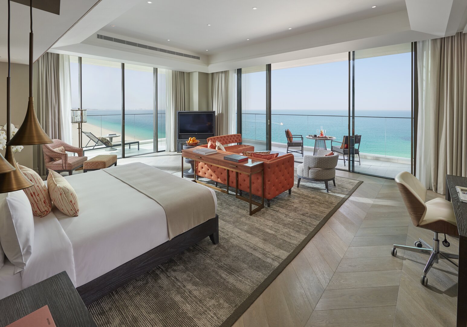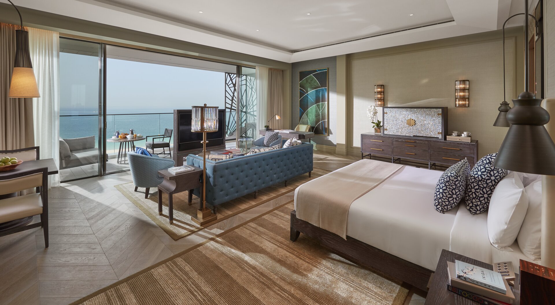 Team Hotels & HideawaysDas Mandarin Oriental Jumeira liegt direkt am Jumeirah Beach mit Zugang zum Strand und bietet einen atemberaubenden Blick auf den Persischen Golf oder – je nach Zimmerlage – auf Dubais Skyline und den Burj Khalifa. Auch die Lobby beeindruckt: Weitläufigkeit trifft auf helle Farben und modernes Design mit hohen Lampen in Form weißer Bäume und goldenen Verzierungen – ein klares Zeichen für Dubais Sinn für Prunk. Die Zimmer und Suiten mit über 50 Quadratmetern bieten viel Platz und ein helles, modernes Ambiente mit stilvollen Farbakzenten. Geräumige Badezimmer aus Marmor und Holz runden das Wohlfühlerlebnis ab. Das Hotel bietet zudem mehrere erstklassige Restaurants und Bars – darunter eine Kaviar-Bar.