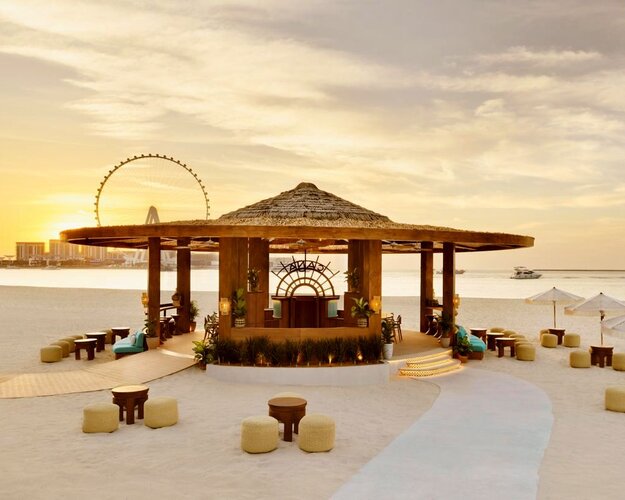 Ein Sundowner am privaten Strand, während ‚The Walk‘ am Horizont pulsiert — hier verschmelzen Ruhe und urbanes Leben zu einem unvergesslichen Augenblick