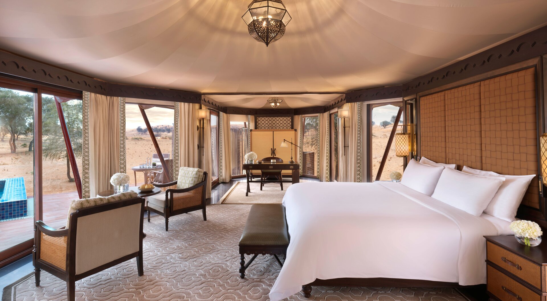 Team Hotels & HideawaysDieses Pool-Villa-Resort im Beduinenstil, das früher von Banyan Tree geführt wurde und inmitten der Dünen im nördlichen Emirat Ras al Khamiah liegt, wurde als Ritz-Carlton-Anwesen mit einem frischen neuen Look und einer Reihe von beeindruckenden Outdoor-Abenteuern neu aufgelegt. Diese reichen von Reiten und Kameltouren bei Sonnenuntergang in die Wüste bis hin zu Falken-Shows und Sternbeobachtungen vom privaten Hubschrauberlandeplatz aus. Zudem befindet sich die Anlage mitten im 500 Hektar großen Naturschutzgebiet Al Wadi, in dem sich einheimische Wildtiere wie Antilopen, der arabische Oryx und Gazellen den Gästen fast zum Anfassen nähern. Jede der wunderschönen 100 Villen verfügt über eine große möblierte Außenterrasse mit privatem Infinity-Pool, von denen einige direkt zu den Dünen führen.