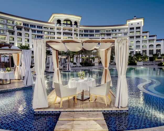Team Hotels & HideawaysHubschrauberflüge vom Hubschrauberlandeplatz und Wasserbett - Liegen im Spa deuten bereits auf die Opulenz dieses palastartigen Luxushotels hin. Das Waldorf Astoria liegt auf der künstlichen Insel Palm Jumeirah, die Aussicht reicht an klaren Tag bis zum Burj Khalifa in der Innenstadt von Dubai. Stolz steht dieses imposante Resort der segelförmigen Silhouette des Burj Al Arab über dem Arabischen Golf gegenüber. Ein glänzendes Atrium aus grauem Marmor mit Glasliften, die zwischen den sechs Etagen des Hotels auf- und abgleiten, verleihen dem Waldorf Astoria dabei den Charme der alten Welt. Alle Zimmer verfügen über einen Balkon, fast alle mit Meerblick und im Restaurant „Social by Heinz Beck“ erwarten Sie wahre Gaumenfreuden auf Sterneniveau.