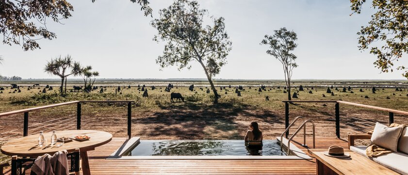 Von Darwin geht es am Mittag mit dem Kleinflugzeug in den westlichen Teil des berühmten Kakadu-Nationalparks (Flugdauer ca. 20 min.). Hoch im Norden, am Rande des australischen Kontinents, erwartet Sie eines der großartigsten Wildnis-Erlebnisse Australiens. Auf einer Fläche so groß wie Portugal leben nur 20.000 Menschen, dafür umso mehr wilde Tiere, und die Spuren der Aborigine-Vergangenheit sind noch unverwischt. Diese Region wird nur selten von Touristen besucht, denn man darf sie nur mit Einladung der Yolngu-People betreten. In bester Safari-Tradition wurde am Ufer des Mary River das Camp Bamurru Plains erbaut, direkt an der Grenze zum UNESCO-Welterbe Kakadu Park. Die Safari-Suiten bieten allerhöchsten Komfort und trotzdem ein Gefühl von Freisein und Wildnis: Wild Bush Luxury der Extraklasse. Dingos, Wasserbüffel, Goannas, Wallabies und Brumbies - die Tierwelt ist reich und vielfältig. Kein Telefon, kein TV stört die Ruhe und die Klänge der Natur. (F/A)