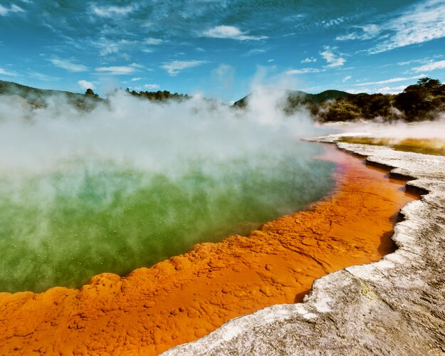 Am heutigen Tag besuchen Sie das Te Puia Thermal-Gebiet, welches bekannt ist für kochende Schlammtümpel, spektakuläre Geysire und zischende Dampfschwaden. Der Pohutu Geysir ist der größte auf der Südhalbkugel! Die Maori betrachteten diese Naturschauspiele als Geschenke der Götter, ausführlich dokumentiert im nahegelegenen Maori-Kulturzentrum. Lohnenswert ist auch der Besuch im Kiwi Conservation Center: Hier können Sie diese gefährdeten Vögel in einem speziellen, abgedunkelten Gehege aus nächster Nähe betrachten und erfahren, wie sich die Rettungsstation für ihren Schutz einsetzt. Am Abend laden wir Sie zu einem traditionellen Hangi-Dinner mit kultureller Tanzshow ein. (F/A)
