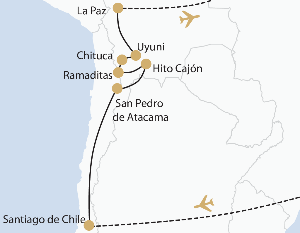 Ein intensives Erlebnis mit privatem Guide: Von den Geysiren, Terracotta-Bergen und tiefblauen Lagunen der Atacama-Wüste bis zum endlosen Weiß der Uyuni-Salzebene: Entdecken Sie zwei der faszinierendsten Orte auf dem südamerikanischen Kontinent ganz privat und abgelegen. Die stylischen Explora Lodges sind Ihr Zuhause in der Weite des Altiplano, wo die Einsamkeit ebenso überwältigt wie die Schönheit. Ein weiterer Höhepunkt ist die Übernachtung im außergewöhnlichen Salzhotel. Nach der „Travesia“ durch die Anden erreichen Sie das unerwartet moderne La Paz. Die bolivianische Hauptstadt überrascht mit trendigen Restaurants, einer bunten Kunst und Modeszene.